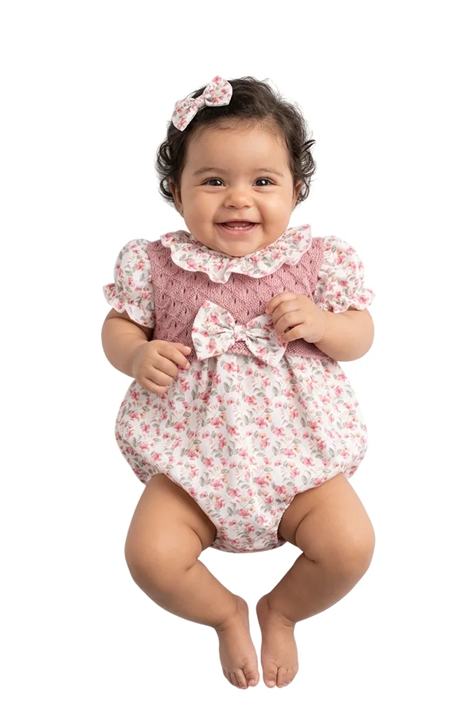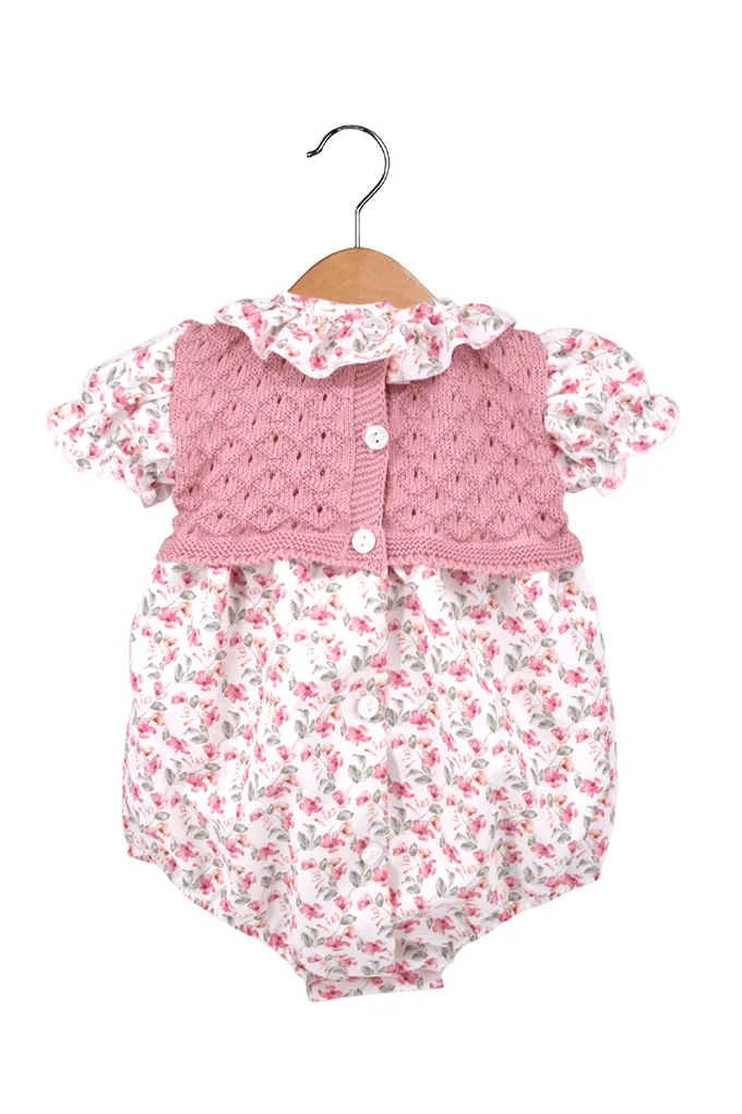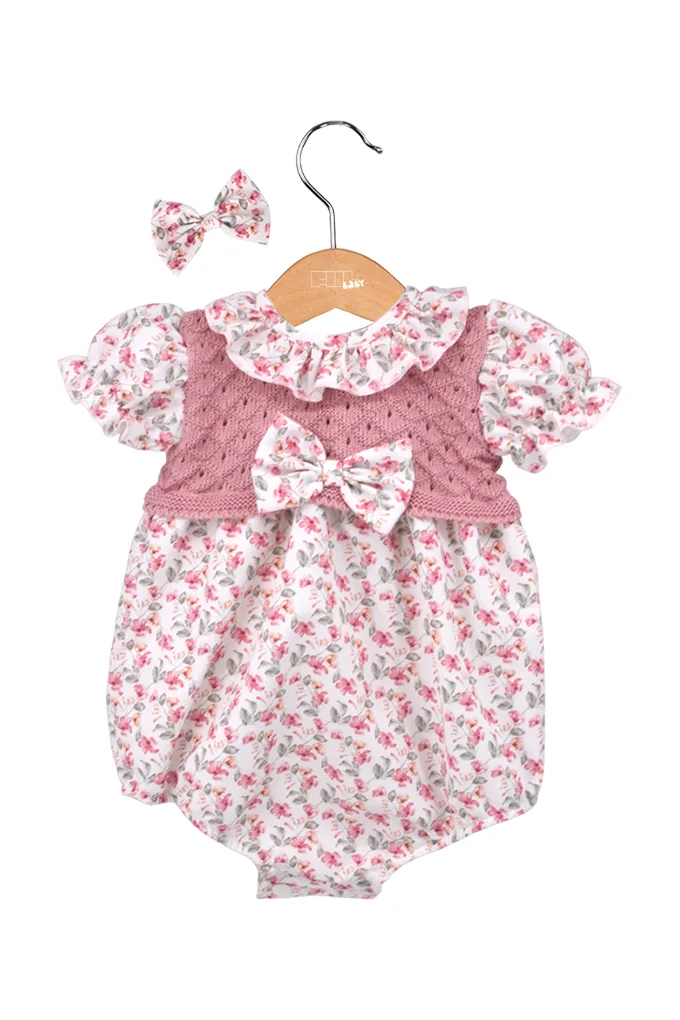 Dieser einteilige Baby-Strampler besticht durch ein romantisches Design mit einem rosa Strickoberteil und einem floral bedruckten Unterteil. Das Kleidungsstück überzeugt durch liebevolle Details wie einen Rüschenkragen, kurze Puffärmel und eine dekorative Schleife in der Taillenmitte. Abgerundet wird das Set durch eine passende Haarspange im gleichen Blumenmuster.